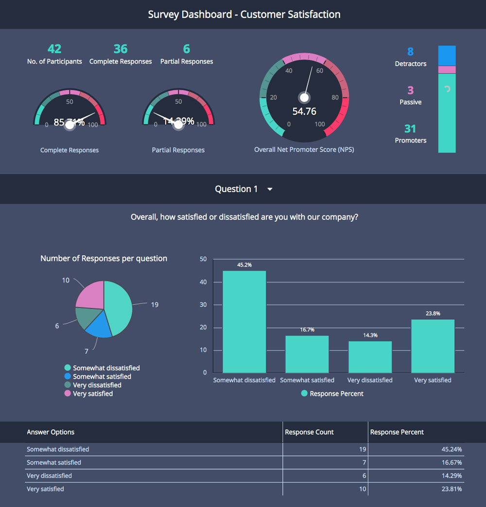 Customer satisfaction dashboards enable you to understand how your customers perceive your services and products like never before. In this highly competitive environment, if you don’t know your customers’ perception of the quality, effectiveness, and responsiveness of your service, you are at risk of losing a customer. Analyzing and displaying those results in a visual representation is a powerful way to assess what improvements need to be made in the organization’s processes, personnel, systems and other operational functions. Don’t wait to lose a customer before you seek learn their needs and business pains.